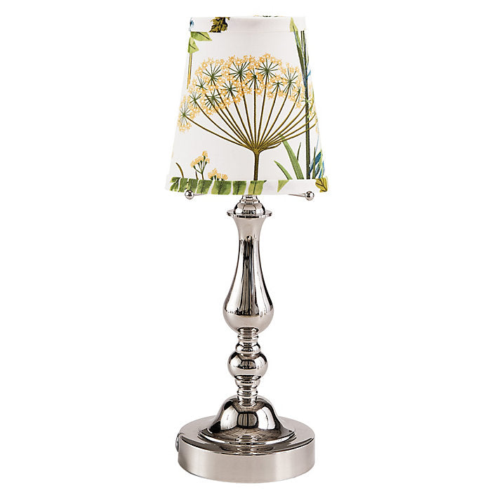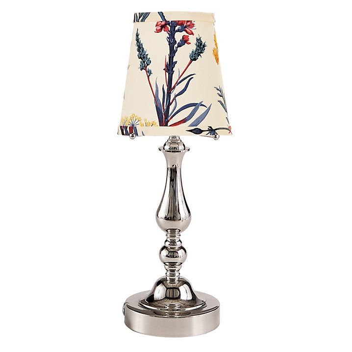 This petite, go-anywhere accent lamp offers a light-filled stage for showing off your favorite chandelier shade. The cordless, rechargeable candlestick base has a frosted LED disc light at the top and four prongs to support a regular or tall chandelier shade. The clever design makes it beautifully easy to swap out and coordinate shades with your table decor. Pick your favorite shade from our fashion-forward online collection.