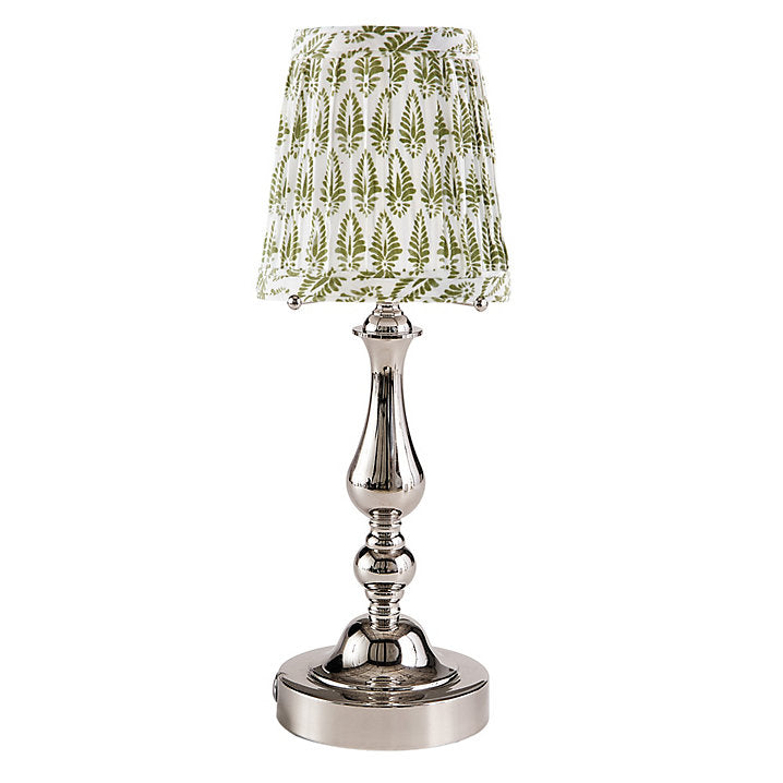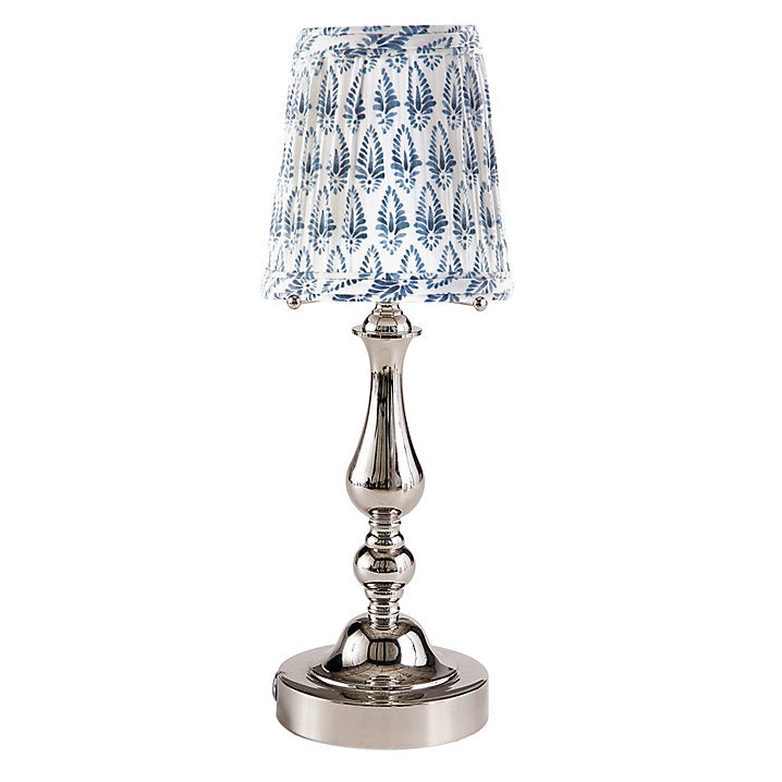This petite, go-anywhere accent lamp offers a light-filled stage for showing off your favorite chandelier shade. The cordless, rechargeable candlestick base has a frosted LED disc light at the top and four prongs to support a regular or tall chandelier shade. The clever design makes it beautifully easy to swap out and coordinate shades with your table decor. Pick your favorite shade from our fashion-forward online collection.