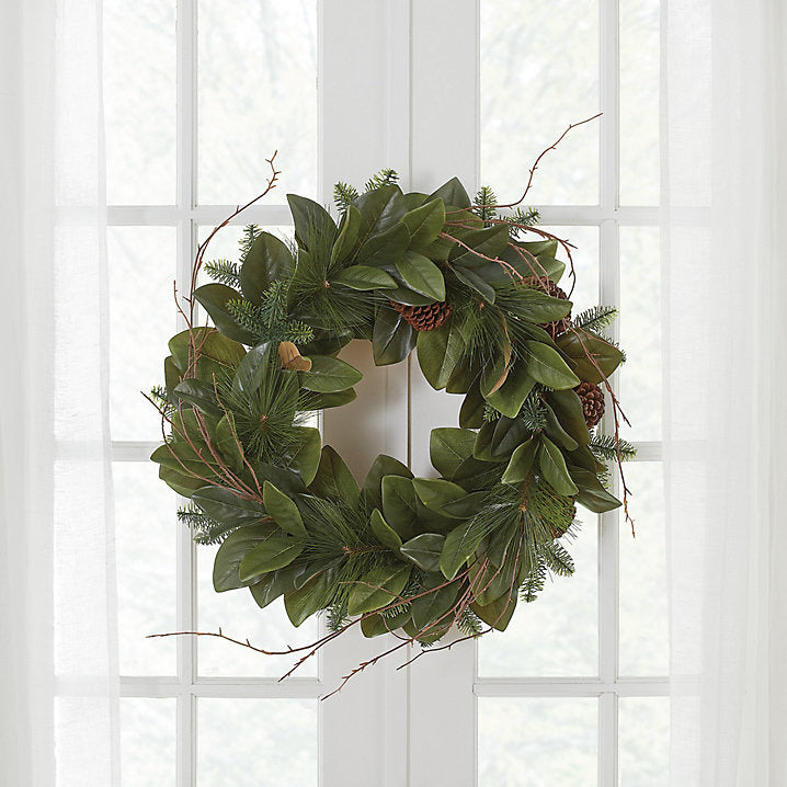 The blending of handcrafted magnolia, pine boughs and real pinecones give this everlasting Christmas greenery a natural, unstructured look. Add your own berries for a pop of holiday red color or tuck it with any of our Holiday Branches for a festive look.