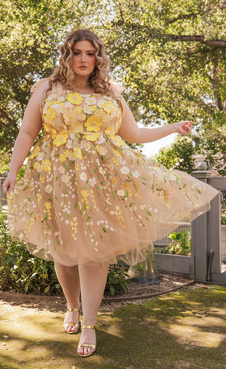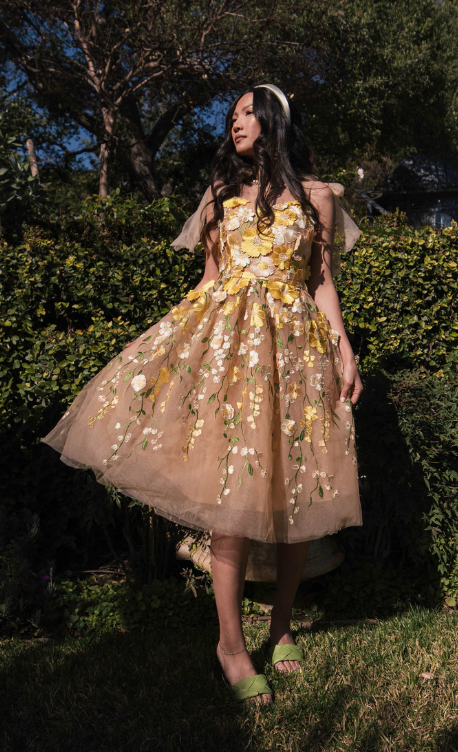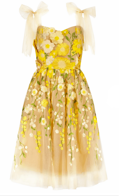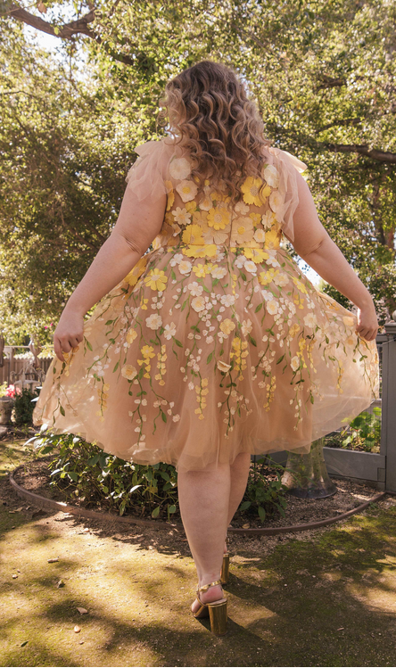 Introducing our enchanting Blossom Dress, a whimsical masterpiece that brings the magic of the garden to life. Adorned with delicate pink and yellow blossoms, this dress embraces the essence of grace & beauty, creating a captivating silhouette that flutters with every step.