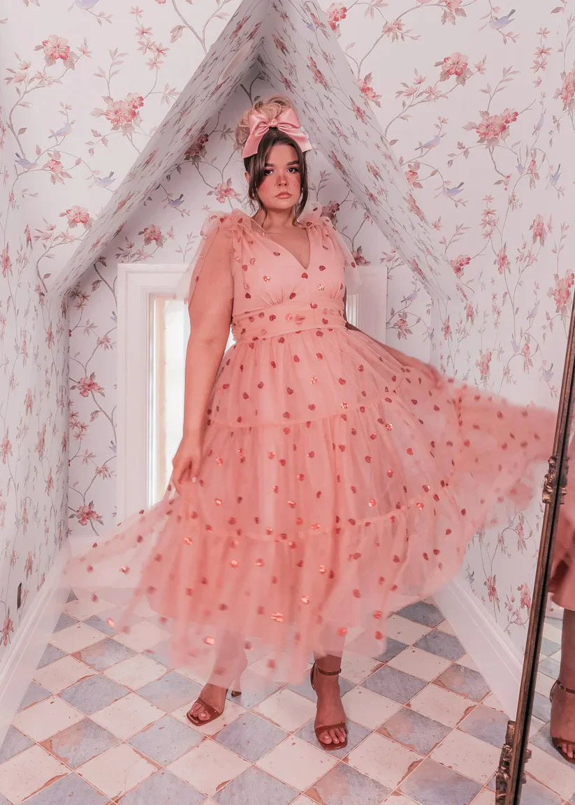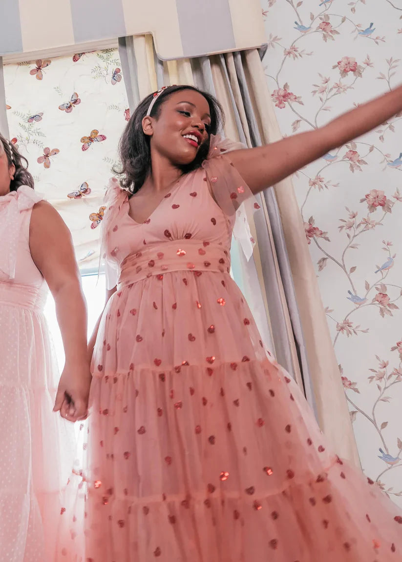 There are dresses, and then there are dresses like this. The Sweetheart Dress is a timeless piece that can take you from day to night in an instant. Featuring a swiss dot print, a flattering V-neckline, ties on the sleeves, and the sweetest sequin heart detail, this is a dress designed for the girl who loves to stand out. A slight open back completes the look with feminine charm.