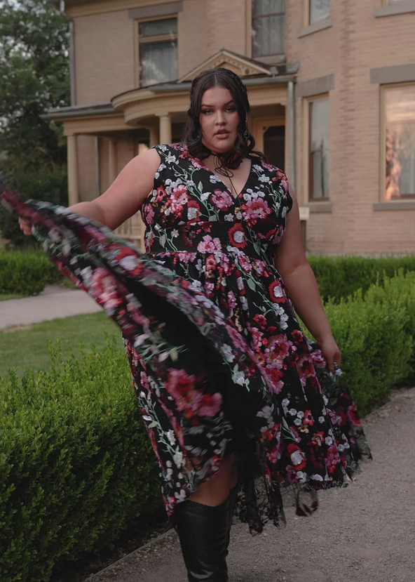 Ebony Rose is a captivating celebration of romance and elegance, featuring a rich tapestry of vibrant florals set against a deep black background. The plunging neckline and high-low hemline add a modern twist to this classic silhouette, making it perfect for those who want to make a bold yet feminine statement. Whether you're attending a garden party or an evening soiree, this gown is your go-to for a look that's both timeless and unforgettable.
