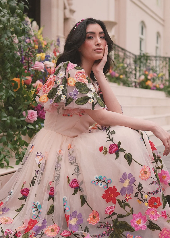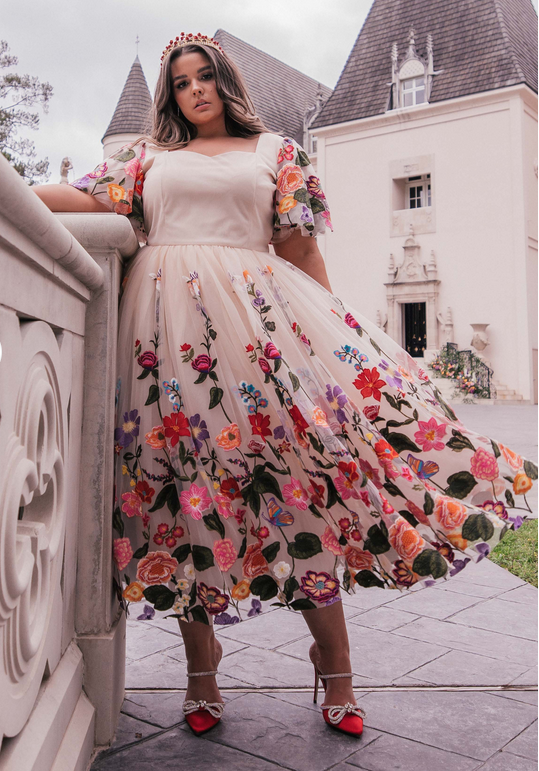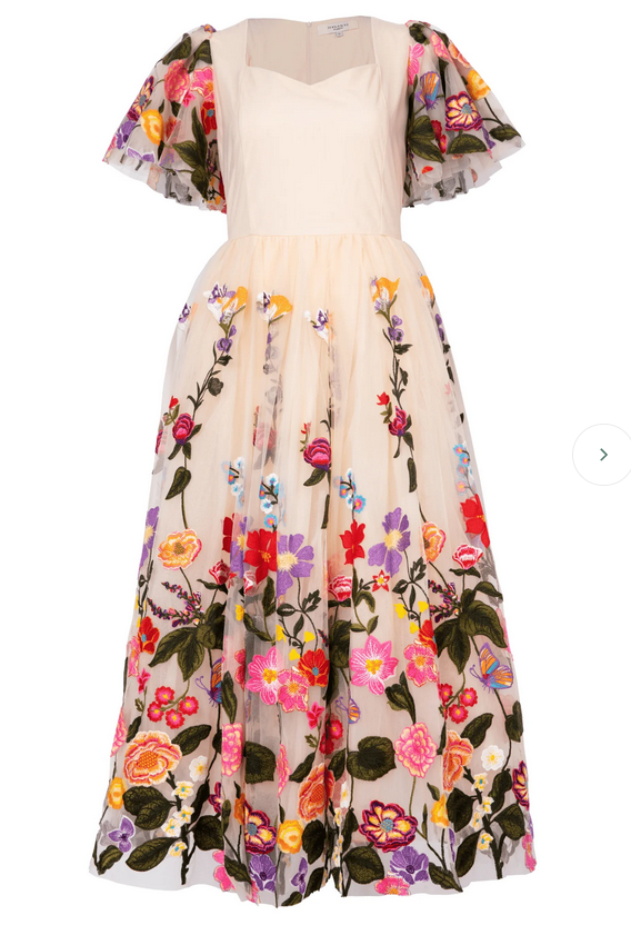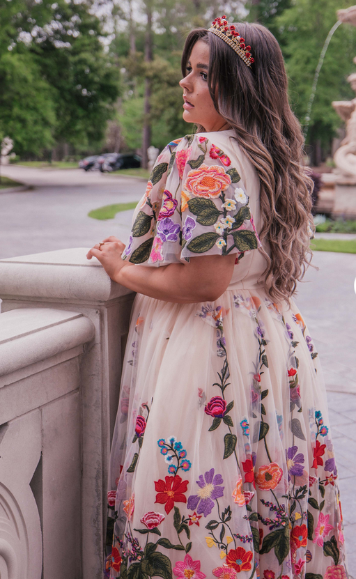 This regal princess dress is blooming with beauty - sweet floral and butterfly embroidery dances along the skirt and flutter sleeves. We can't wait to see you twirl in this one.