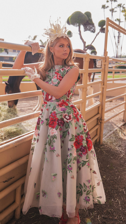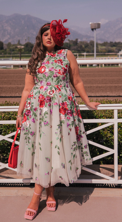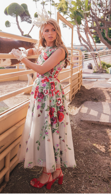 Inspired by the grand tradition of the Derby races, this alluring masterpiece is destined to command the gaze of every eye you meet. This sleeveless A-line silhouette denotes a timeless grace and poise. Adorned in shades of red and green, this rose design ensures its wearer shines with the luster of the season's boldest bloom. This garden party favorite emulates a joyful beauty, sweetly suited for the lady who intends to make a statement of a splendid, vibrant life.