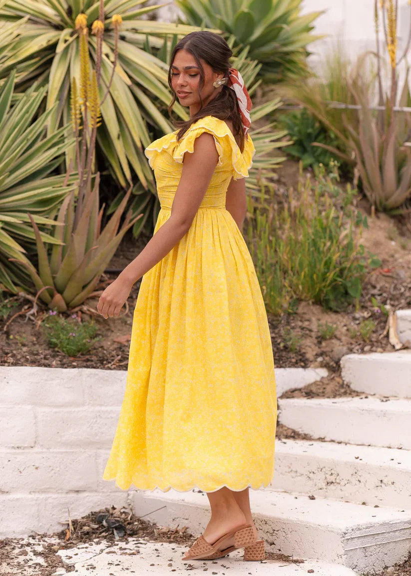 The Marisol Dress is pure sunshine in dress form, featuring a soft yellow floral print that radiates joy. With flutter sleeves, a sweet scalloped neckline, and a twirl-worthy skirt, it’s both playful and elegant. The scalloped hem adds a touch of charm, making it perfect for sunny celebrations or everyday magic. Light, bright, and effortlessly lovely—just like you.