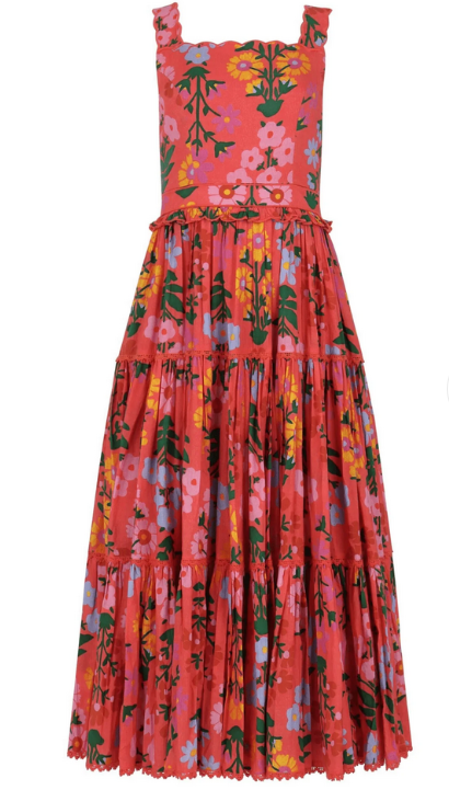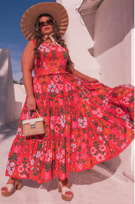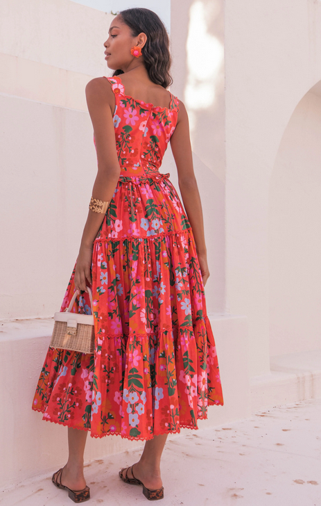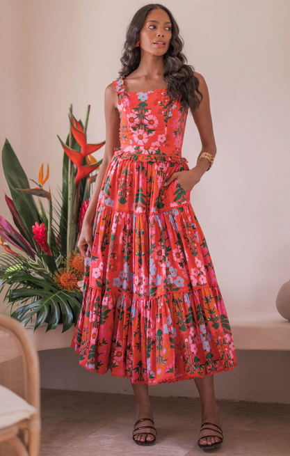 Step into the vibrant essence of the tropics with our stunning coral dress adorned with a delightful array of tropical blooms and lush leaves. This enchanting piece captures the spirit of a tropical paradise, offering a fusion of elegance and exotic charm. Features a scalloped edge square neckline and a tiered ruffle skirt. Perfect for any summer soiree, its flowing silhouette and intricate print evoke the allure of a sun-kissed island getaway, ensuring you stand out with effortless grace and style.