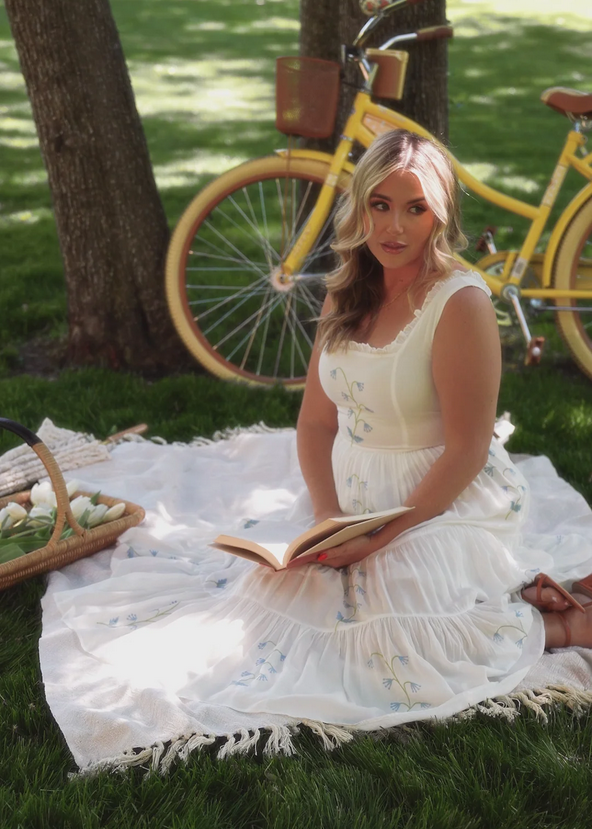 Embrace the serene beauty of the outdoors with our Summer Meadow Dress. This enchanting white dress features delicate blue floral embroidery and a tiered skirt that flows gracefully with every step. The fitted bodice and charming bow detail at the neckline add a touch of romantic elegance, making it perfect for picnics and sunny afternoon strolls. Complete with a wide-brimmed hat and a vintage bicycle, the Summer Meadow Dress captures the essence of idyllic summer days.