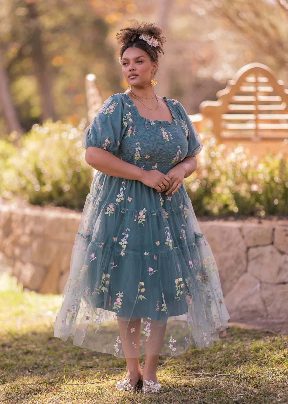 The Talia Dress  features the same beloved silhouette as our best-selling Rose Dress, with a smocked bodice, voluminous puff sleeves, and a flowing tiered skirt. Delicate floral embroidery and whimsical butterfly details add a touch of enchantment, making this dress feel like a fairytale dream. Crafted from airy tulle, it’s perfect for garden parties, special occasions, or any moment you want to feel effortlessly elegant.