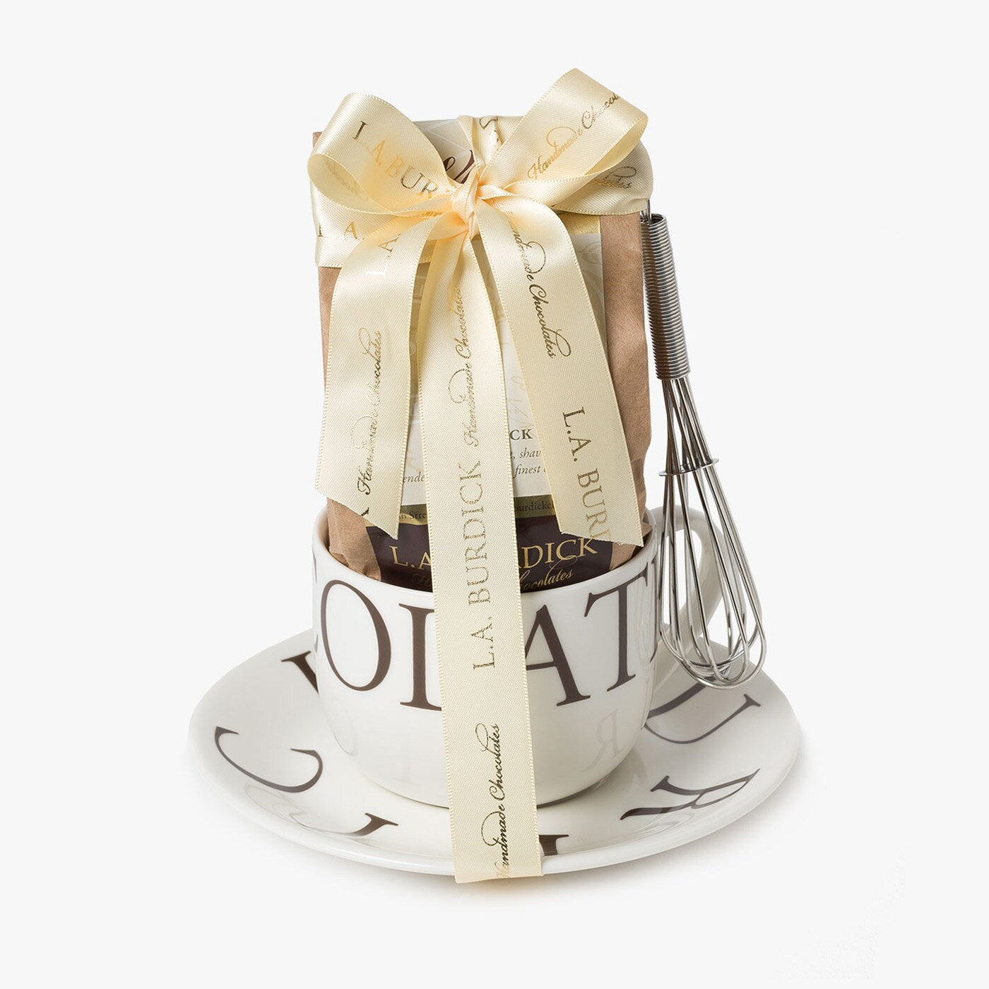 Porcelain cup and saucer set with 12 oz. Burdick Blend White Drinking Chocolate. Includes a miniature whisk.
