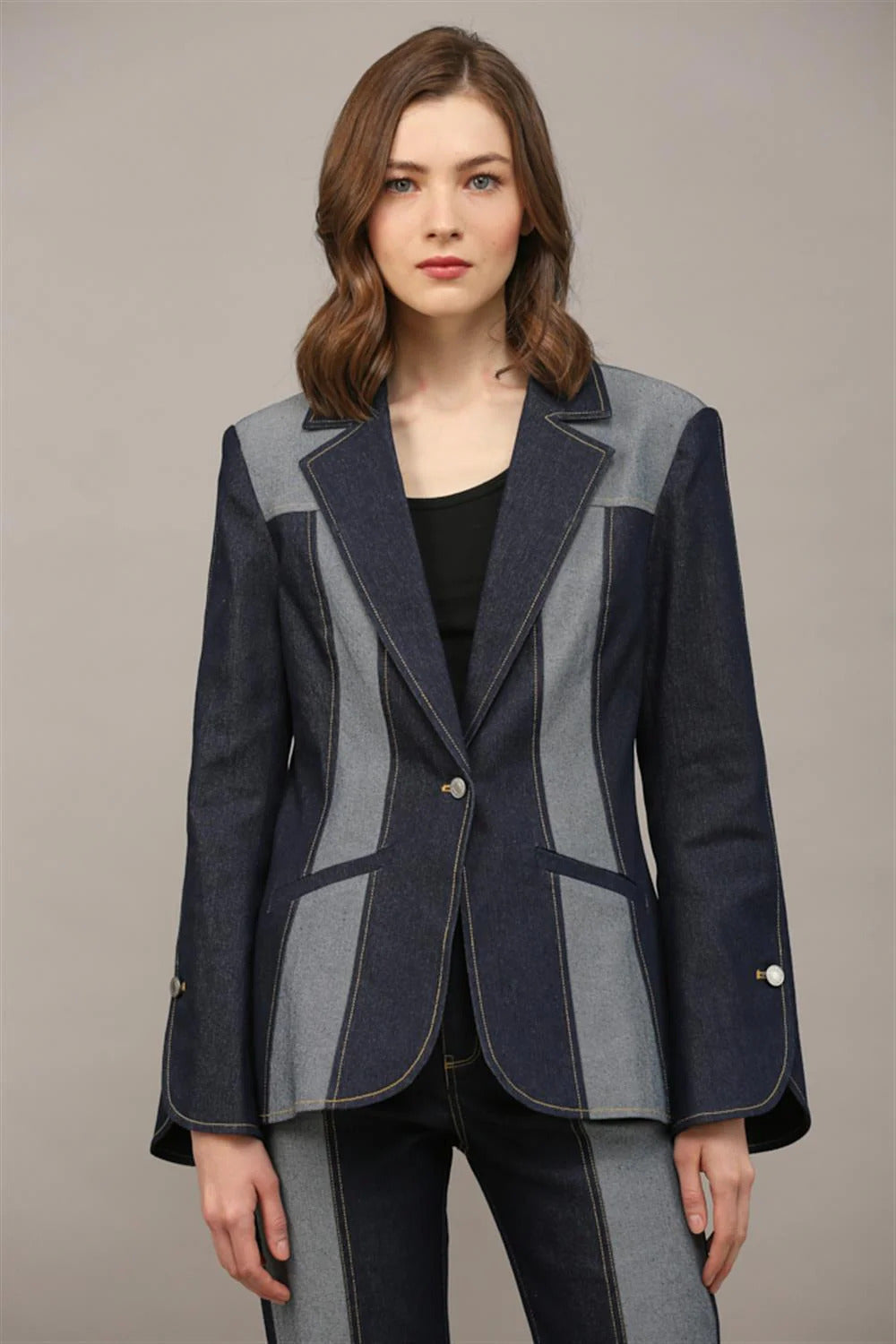 Ruby & Jenna Women's Welt Pocket Two Tone Denim Blazer