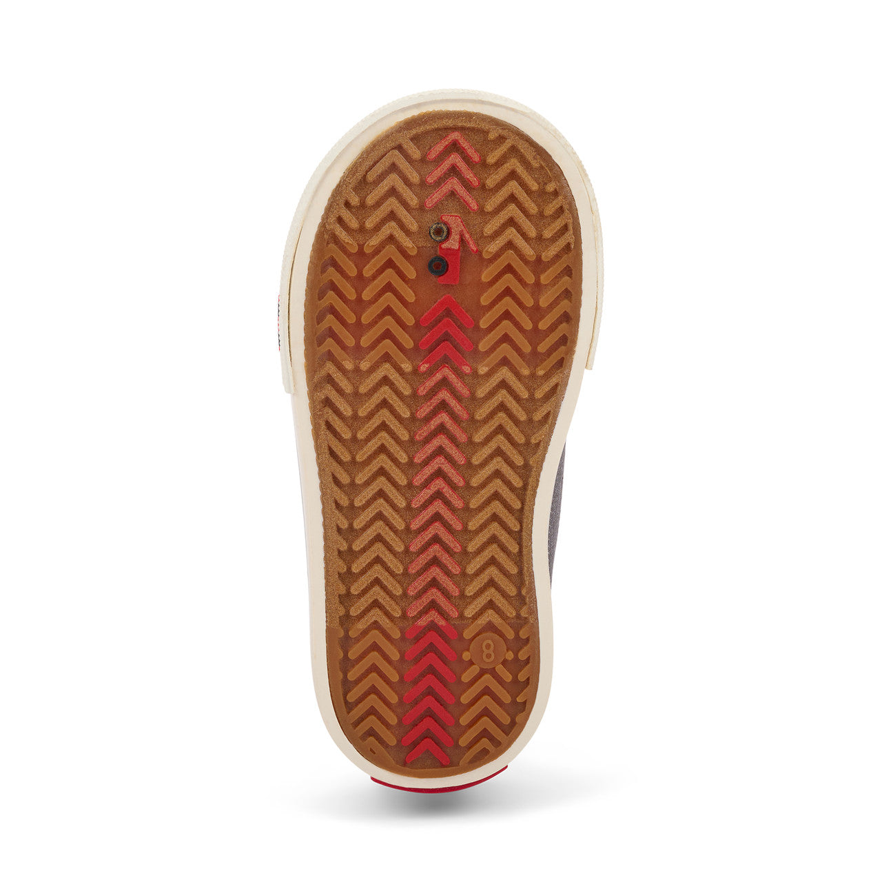 Natural rubber outsole with herringbone lug pattern provides great traction for play.