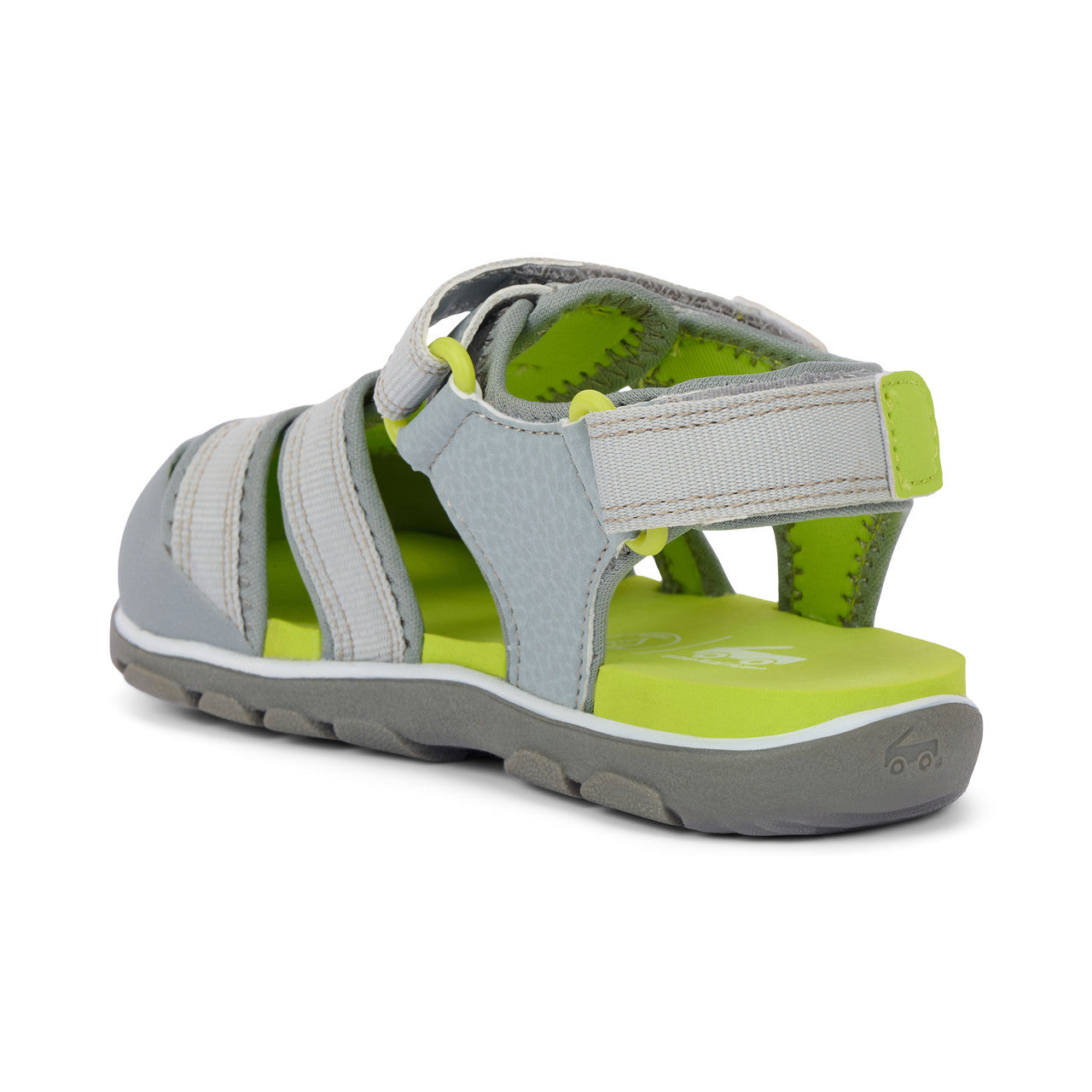 Gray textile upper with water-friendly webbing straps and supportive faux leather heel. Recycled jersey and nubuck-feel details plus toe cap.