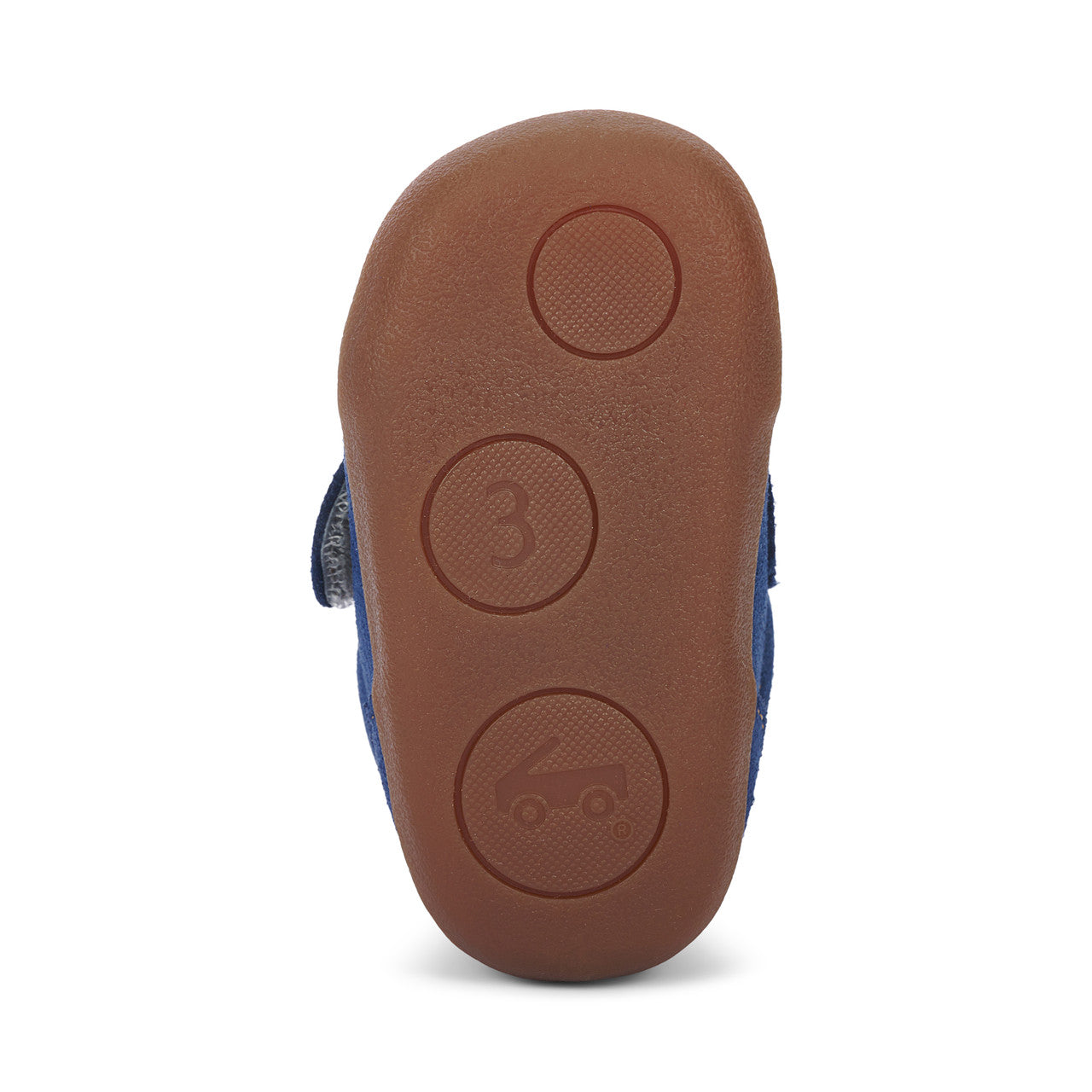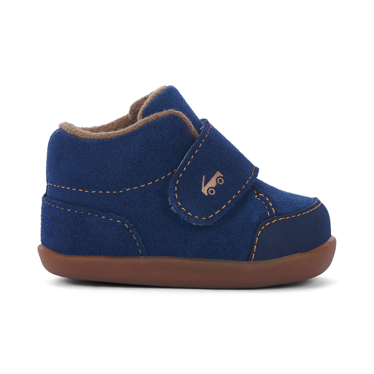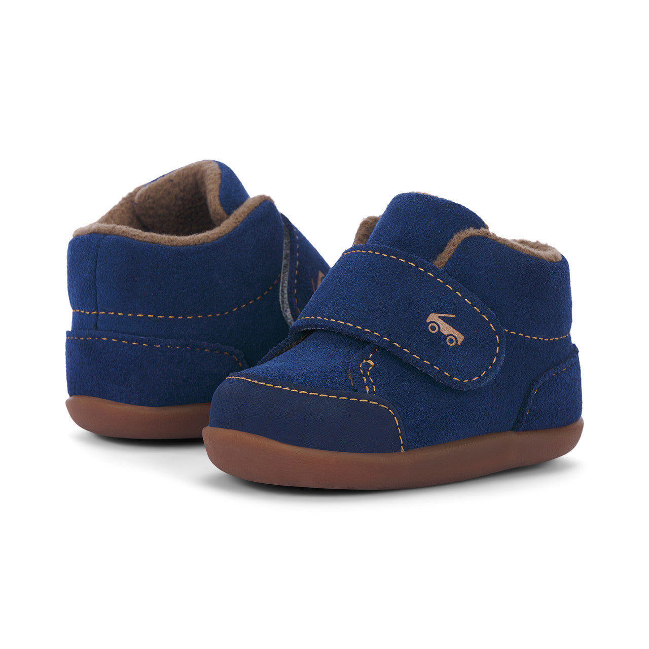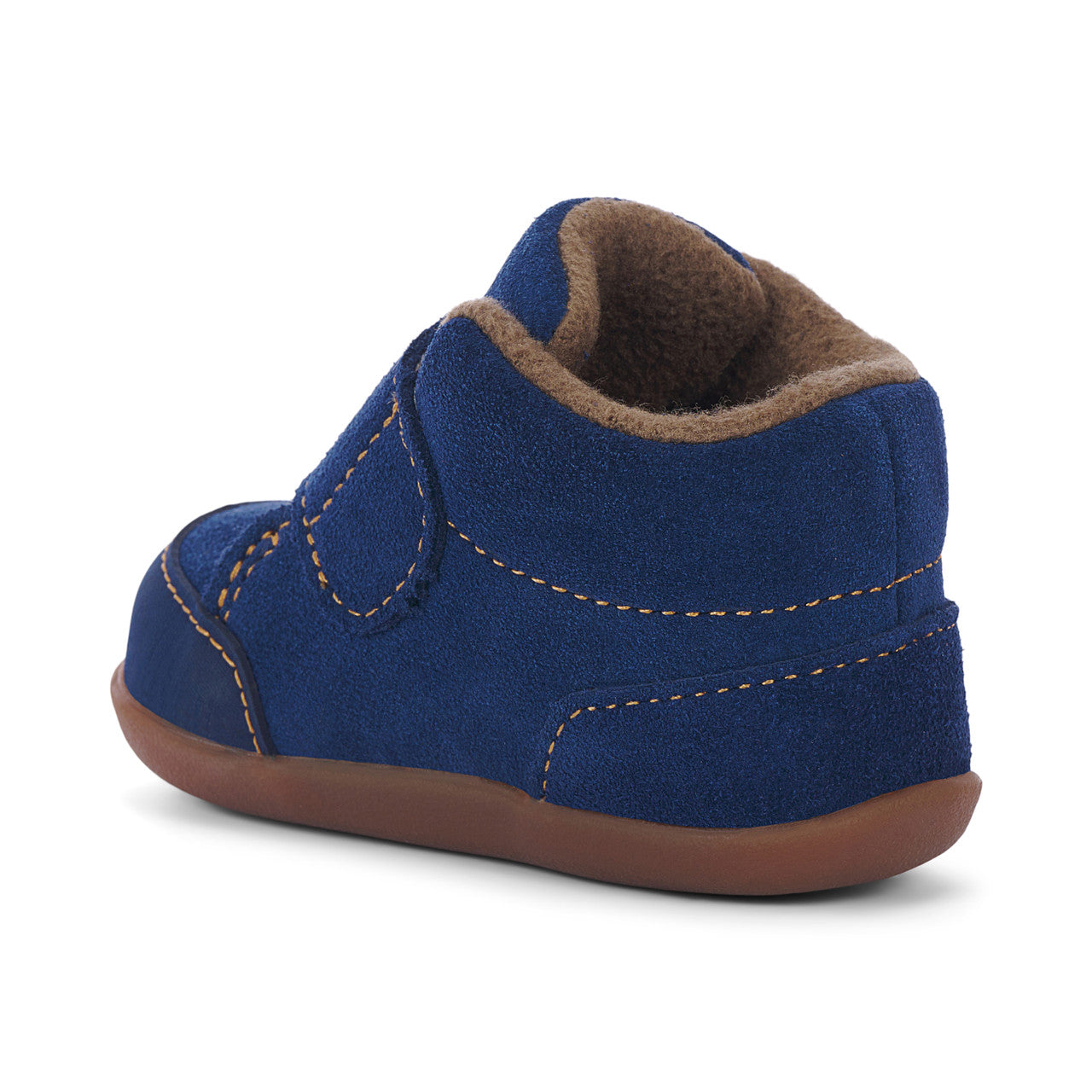 Soft navy suede leather upper and extra durable rubber toe cap to protect little toes.