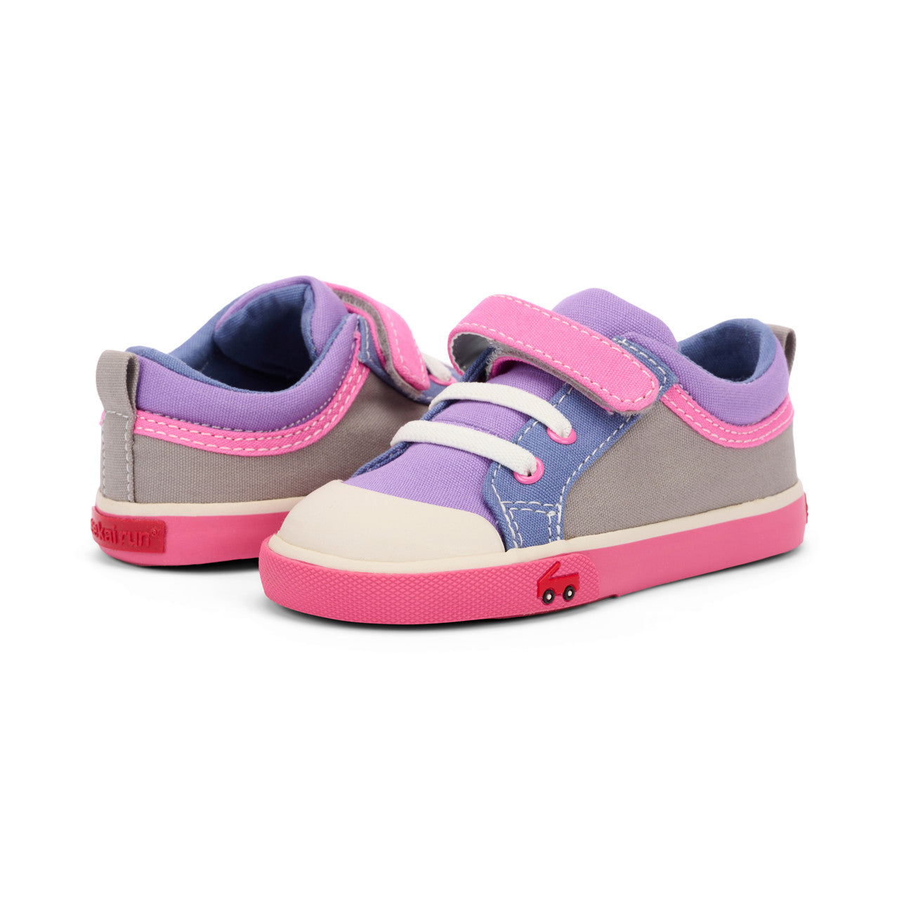 Check out this classic, fan-favorite sneaker for girls.  The canvas upper features cheerful color blocks of blue, purple, and pink for enhanced style. The natural rubber toe cap protects toes during active play.