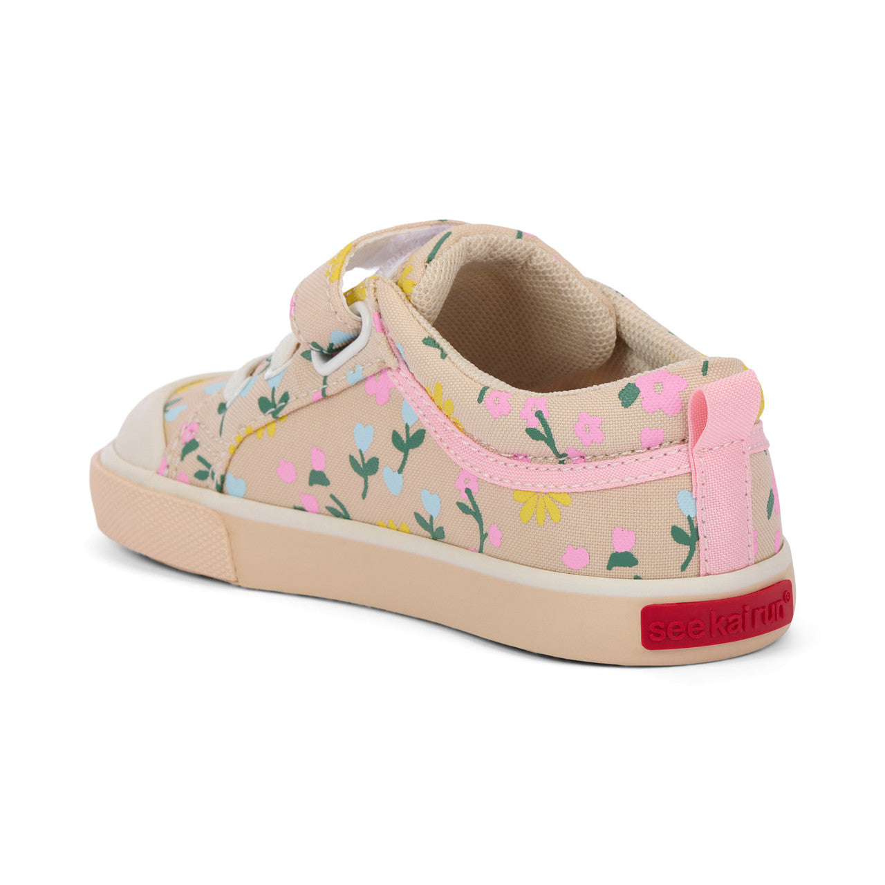 Our web-exclusive denim sneaker just got a delightful twist with a unique, oatmeal color recycled canvas upper with seasonal floral bloom touches. It features a 100% leather-lined, detachable molded footbed for a comfortable foot environment. Plus, a natural rubber toe cap for extra safeguarding.