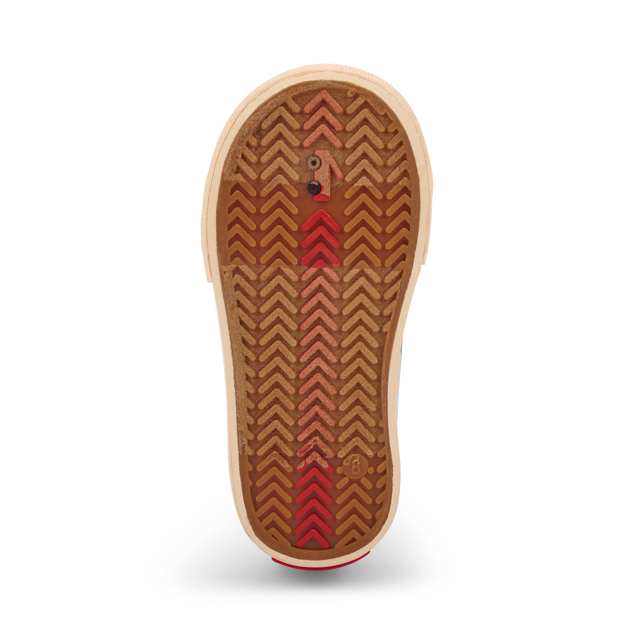 Natural rubber outsole with herringbone lug pattern provides great traction for play.