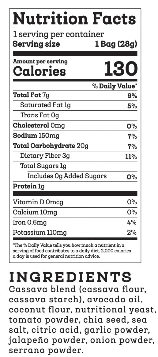 Sometimes we use “nacho” in jest like “these are nacho average chips,” but the flavor on these chips is no joke. We think of the 1oz Nacho chips as the smaller (but just as feisty) flavor-twin to the 4 oz Nacho (#twinning!). Which makes them the youngest sibling to original, subtler 5 oz Nacho Chips. Served in a smaller, crunchier triangles, and covered in our flavorful, dairy free seasoning blend, the 1oz Nacho is the 4oz Nacho’s partner in crime in breaking all the rules the original would have gotten in trouble for.